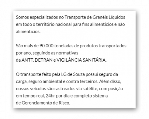 A LG de Souza Transportes nasceu em 2005 pelas mãos do nosso fundador Lucas Garcia de Souza um apaixonado por transportes, decidido em atuar no segmento de alimentos granéis líquidos.